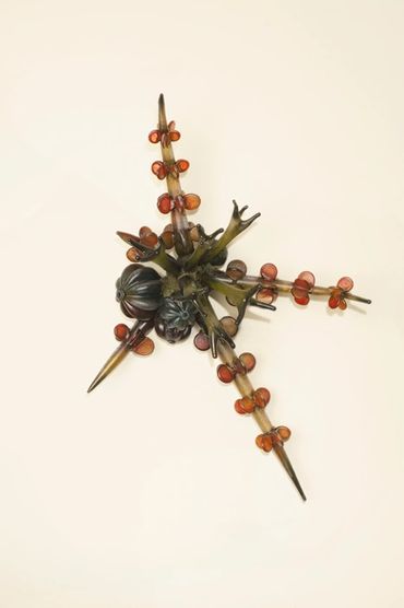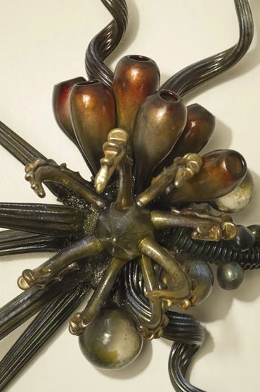 This work consists of tangled clusters of fleshy formations that evoke botanical or zoological specimens. I’m interested in ambiguity and contradiction and want these pieces to suggest familiar forms while remaining open to various associations. My inspirations include the botanical photographs of Karl Blossfeldt, the biological engravings of Ernst Haeckel, and the glass scientific models of Leopold and Rudolf Blaschka. I’ve always been fascinated by the human inclination to seek out and gather odd and novel objects for personal contemplation and public display, an urge exemplified by the “WunderKammer” or cabinets of curiosities of Renaissance Europe. In these pieces, I’m making my oddities and arranging them in compositions meant to elicit a sense of wonder and inquisitiveness.